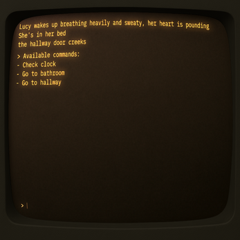 A short horror text adventure where your choices shape Lucy’s path through a world that doesn't quite feel right.